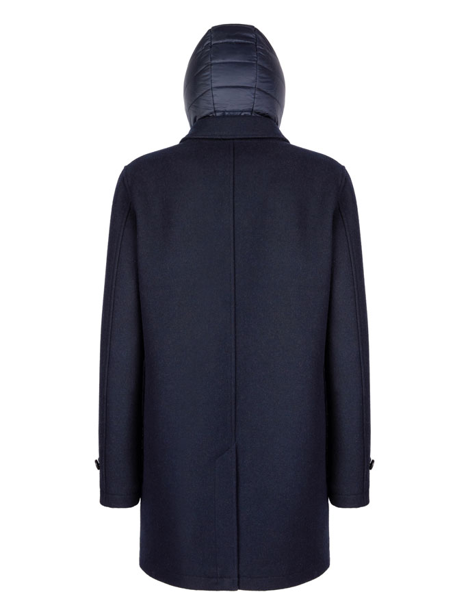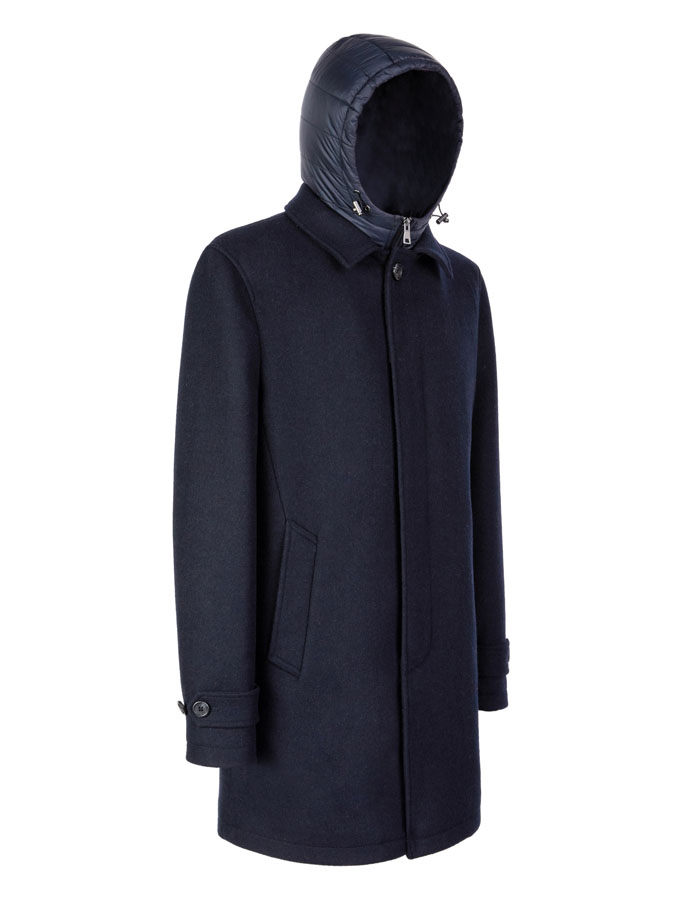 Geox Monreale Long Coat wool jacket for men. It has a removable padded chest/hood section that protects from the wind. The hood has a drawstring.