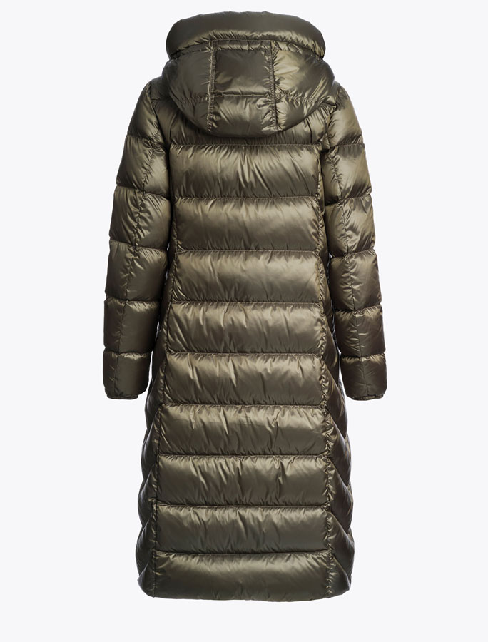 Parajumpers Leah womens down-filled long coat. The hood is adjustable by means of a drawstring. Two zippered pockets in front, underarm vents. Two-way front zip. PJS patch on the left sleeve.