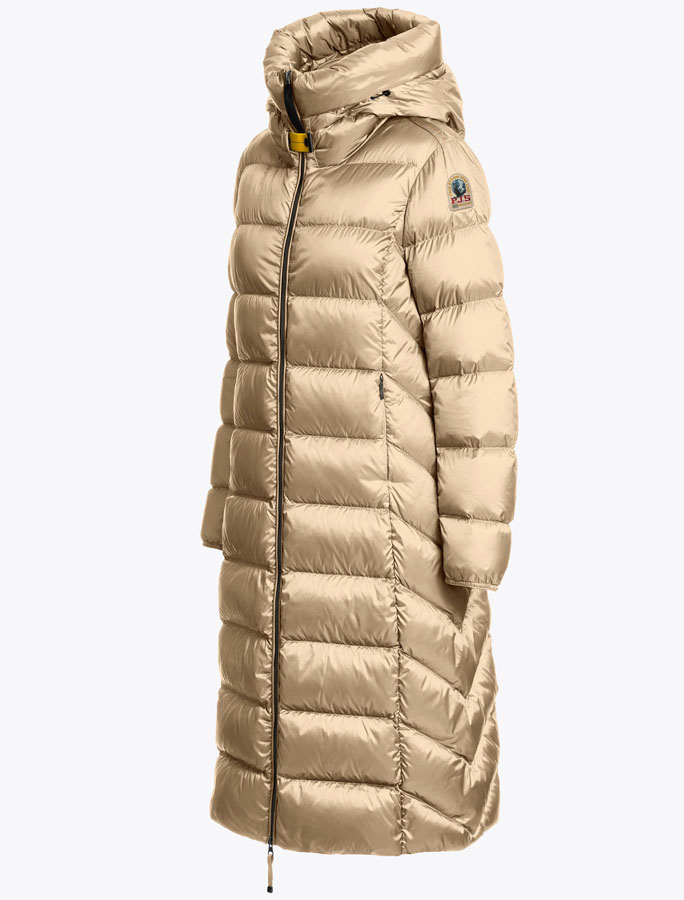 Parajumpers Leah womens down-filled long coat. The hood is adjustable by means of a drawstring. Two zippered pockets in front, underarm vents. Two-way front zip. PJS patch on the left sleeve.